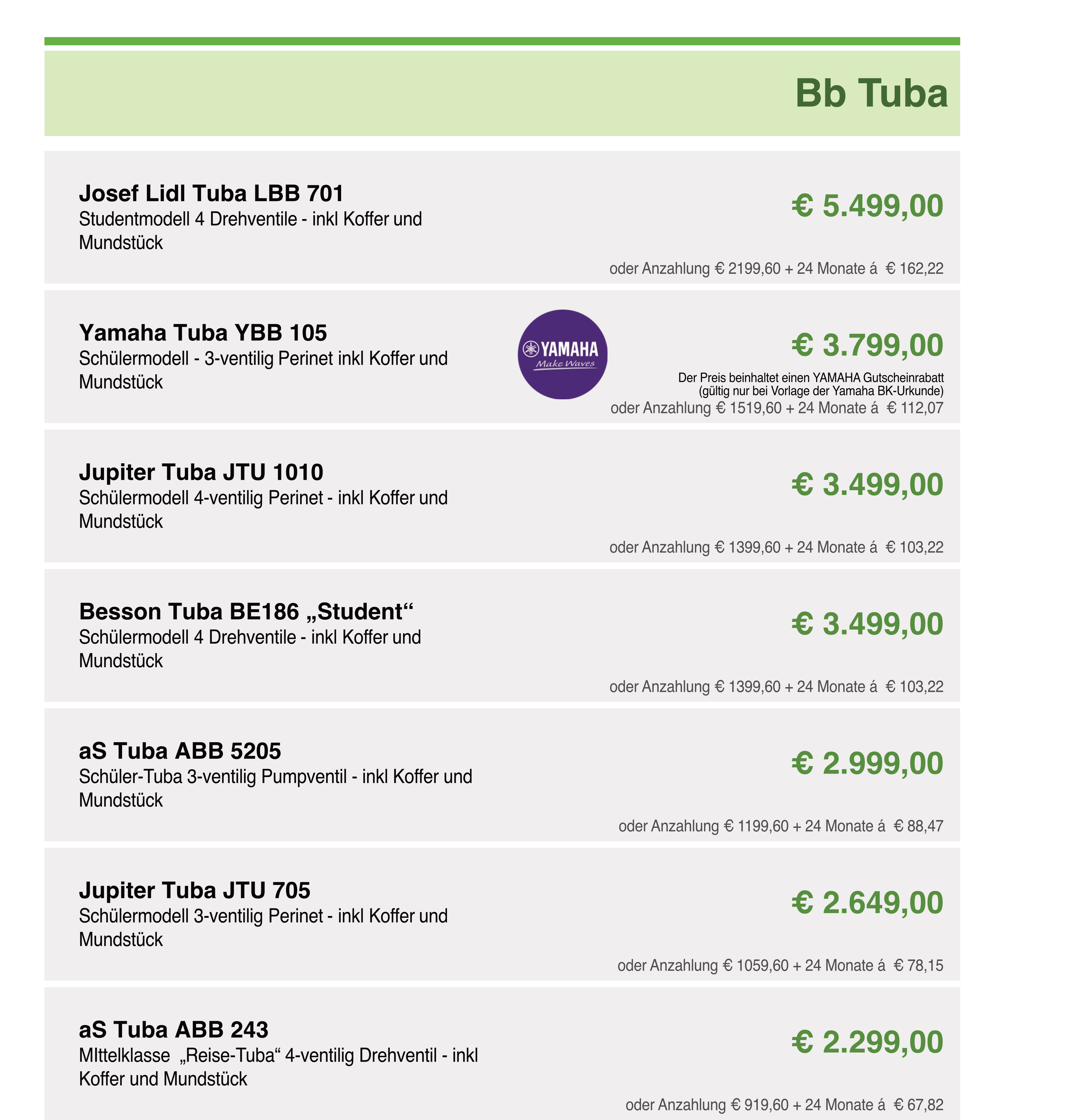 Die Bb-Tuba ist ein großes und tiefes Blechblasinstrument, das oft in Blasorchestern und Brass Bands eingesetzt wird. Sie ist in der Tonlage Bb gestimmt, was bedeutet, dass sie einen Grundton von Bb hat. Die Bb-Tuba hat ein großes Schallstück und eine weite Mensur, was zu einem tiefen und vollen Klang führt. Es gibt verschiedene Modelle von Bb-Tuben, von denen einige über mehr als drei Ventile verfügen, um den Tonumfang zu erweitern. Die Wahl der richtigen Bb-Tuba hängt von verschiedenen Faktoren ab, wie etwa der Größe des Spielers, dem Stil der Musik, die er oder sie spielen möchte, sowie dem Budget.